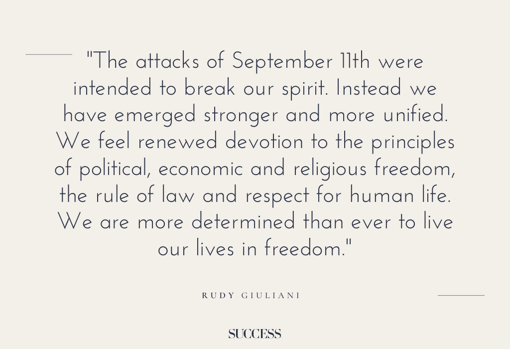 1. “The attacks of September 11th were intended to break our spirit. Instead we have emerged stronger and more unified. We feel renewed devotion to the principles of political, economic and religious freedom, the rule of law and respect for human life. We are more determined than ever to live our lives in freedom.” — Rudy Giuliani