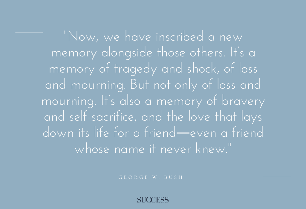 20. “Now, we have inscribed a new memory alongside those others. It’s a memory of tragedy and shock, of loss and mourning. But not only of loss and mourning. It’s also a memory of bravery and self-sacrifice, and the love that lays down its life for a friend―even a friend whose name it never knew.” — George W. Bush