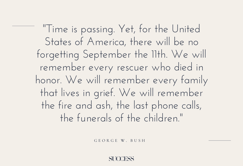 7. “Time is passing. Yet, for the United States of America, there will be no forgetting September the 11th. We will remember every rescuer who died in honor. We will remember every family that lives in grief. We will remember the fire and ash, the last phone calls, the funerals of the children.” — George W. Bush