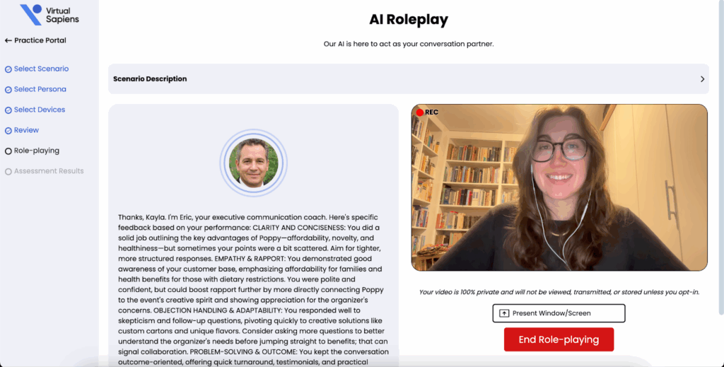 For example, the AI tool Virtual Sapiens allows you to design interactive role play where you can select an angry or defensive conversation partner. You can prompt the AI agent to engage in a conversation that you’re nervous to have, like negotiating for a raise.