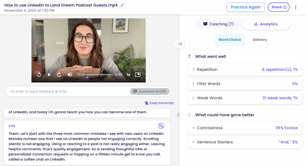 These elements sound intangible, but AI proves that this isn’t the case. With benchmarks on what’s expected in normal conversations, AI tools can extract analytics from your speaking samples. Using the tool Yoodli, you can have a real-time practice session or upload a video of yourself speaking to receive feedback and analytics on your strengths, weaknesses, and growth areas, including eye contact, pacing, pauses, filler words, repetition, weak words, conciseness, and sentence starters.